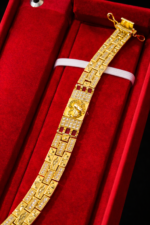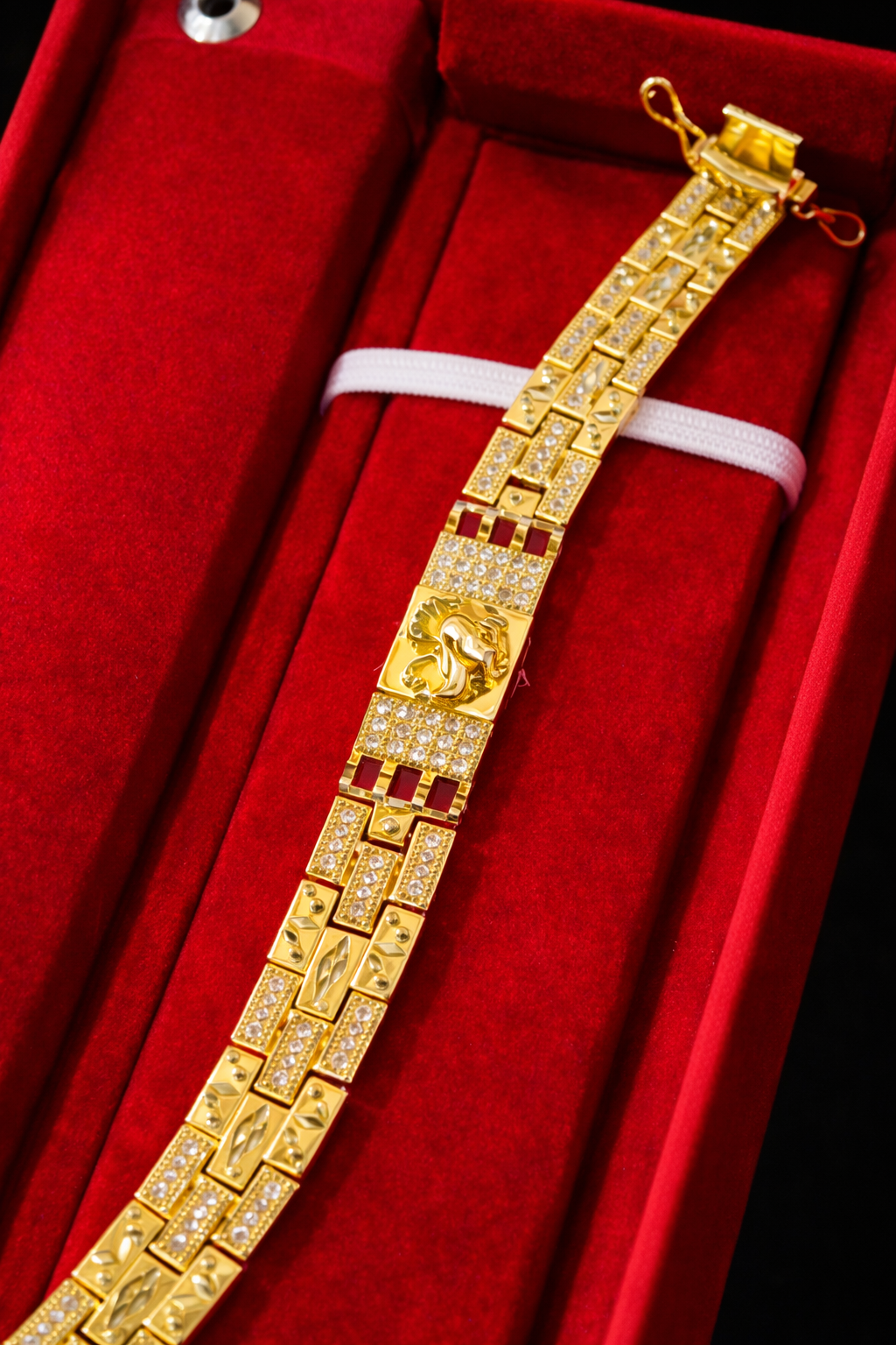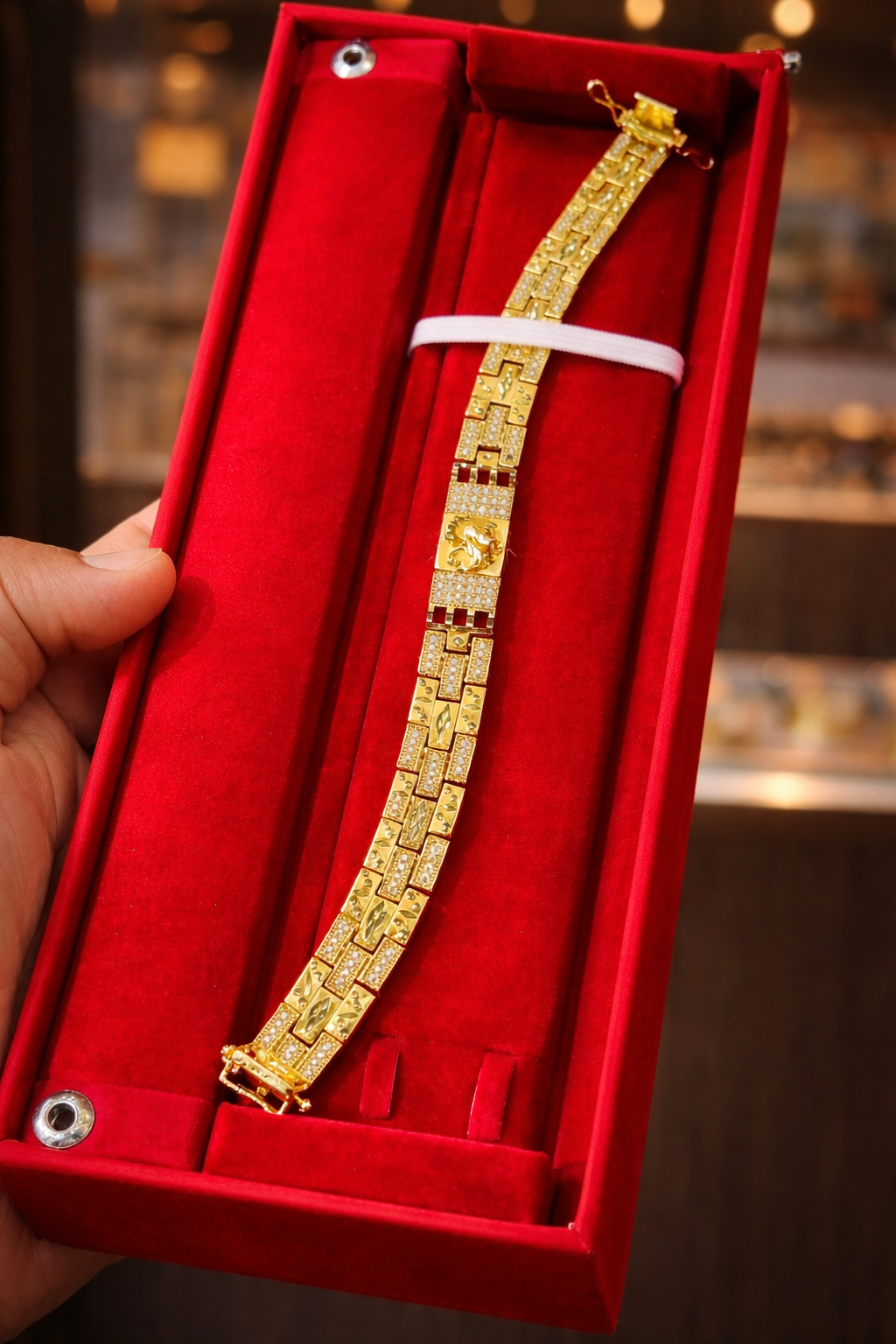 This bracelet combines modern luxury with classic strength. The embedded stones enhance the bold look.